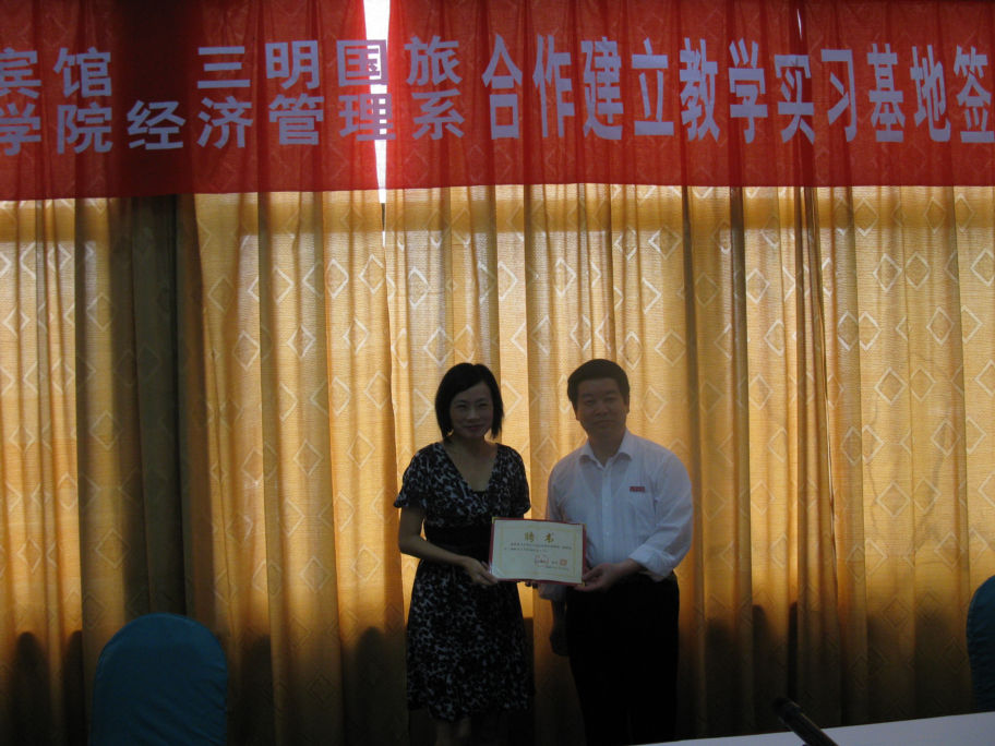据悉,三明宾馆是福建三明天元集团有限公司的控股企业,是我市一家具有33年经营历史的三星级饭店,先后被评为“全国绿色餐饮企业”、“福建省百佳诚信旅游企业”、“三明十大餐饮名店”等,目前已完成建设五星级饭店的规划和立项工作。去年和今年为我校教学实习工作提供了充分的物质和培训师资等保障条件,圆满完成了我校07级和08 级旅游管理专业学生的实习任务。三明国旅有限公司成立于 1989 年,是三明地区唯一一家国际旅行社,是集国内旅游 、入境旅游、出国旅游、航空机票业务为一体的综合型旅行社,先后被评为“福建省优秀旅行社”、“省第三产业 300 强”、“省级青年文明号”、三明市旅游行业“重合同、守信用”单位、“三明市诚信旅行社”等。目前,三明国旅已协助我校完成了旅游专业学生多批次地接导游的培训工作。
