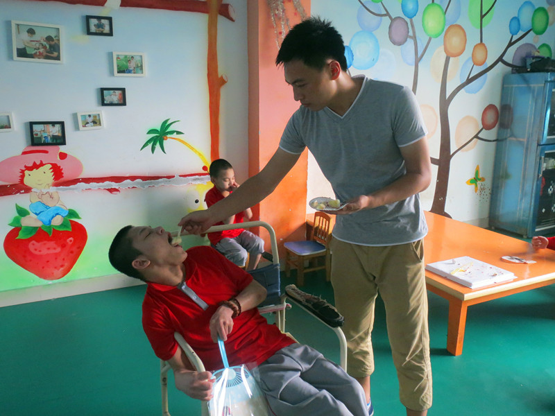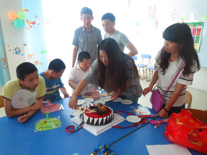 在福利院的儿童康复中心,同学们们与孩子们聊天、游戏,关心慰问孩子们的生活、学习情况,并勉励孩子们好好学习。同学们还为孩子们带来了印有卡通人物的扇子和蛋糕,孩子们争先挑选着自己喜爱的扇子,吃着美味可口的蛋糕,美好温暖的画面让在场的每个人都为之动容。负责照看孩子的李阿姨谈到,福利院里面的大部分孩子都是被遗弃后由警察送到这里的,平时她一个人要照看7-8个孩子,其中最大的已经17岁了,最小才只有几个月。再苦再累,只要看到孩子们的笑脸、听到孩子们的笑声,她也就释怀了。