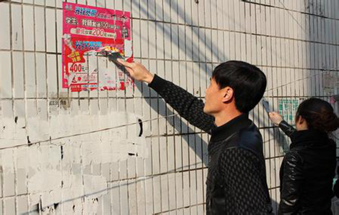 行为体现修养,细节彰显文明。城市“牛皮藓”是指张贴在遍布城市各个角落的“办证”等非法广告以及电话号码。为了保护城市卫生,清除“牛皮藓”,管理学院李宏伟同学和10多位志愿者一起行动起来。