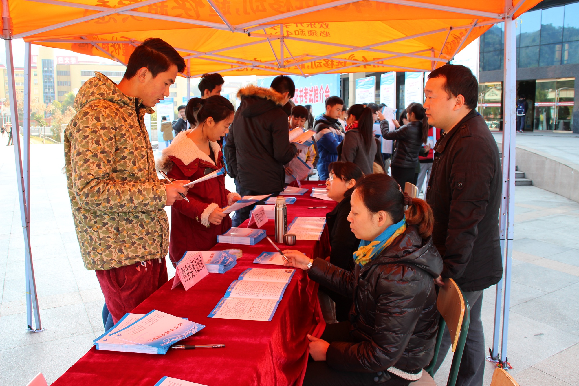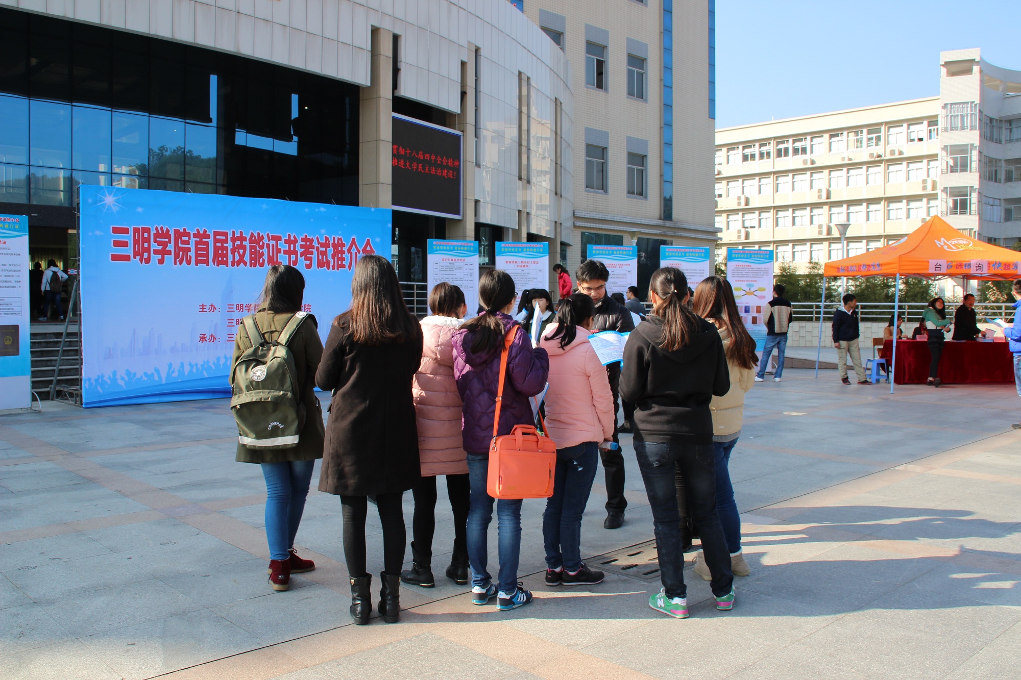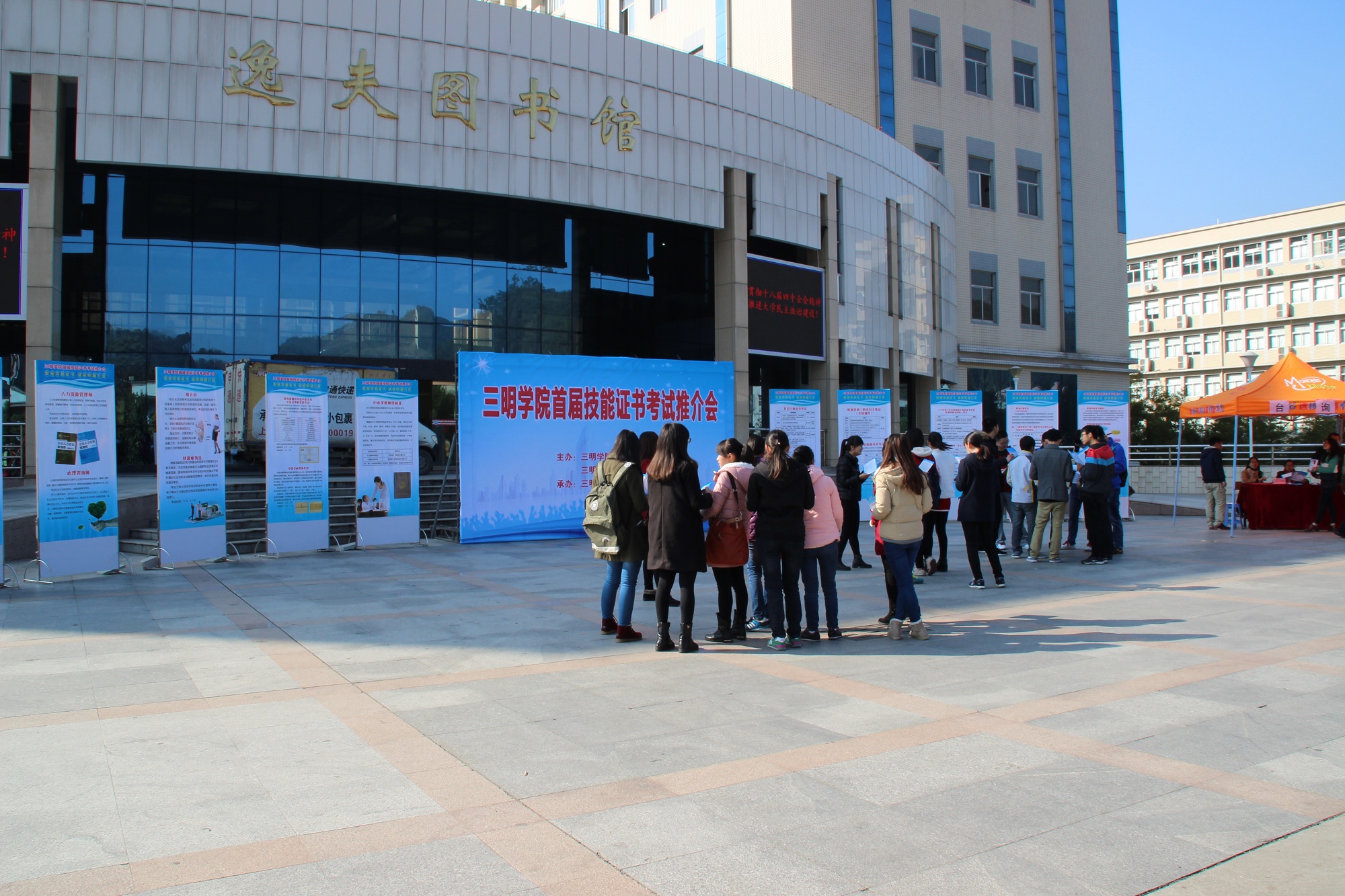 1月15-16日,我校首届技能证书考试推介会在逸夫图书馆前举行。本次推介会面向全校师生,由继续教育学院和教务处主办,管理学院承办。