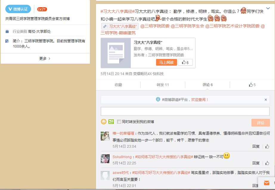 线上线下协奏曲,除了主题团日活动的开展,管理学院团委还通过微博在线上开展了覆盖面更为广泛的讨论活动,微博以话题发布的形式征求同学们对“八字真经”的理解,不少同学作出回应,正如Z妮儿xxxibgdrgn(微博名)所说:“一个人要先修养好自己的德行,再充满理智,去让学习成为一种习惯,从而增长自己的才干,不忘初心。”