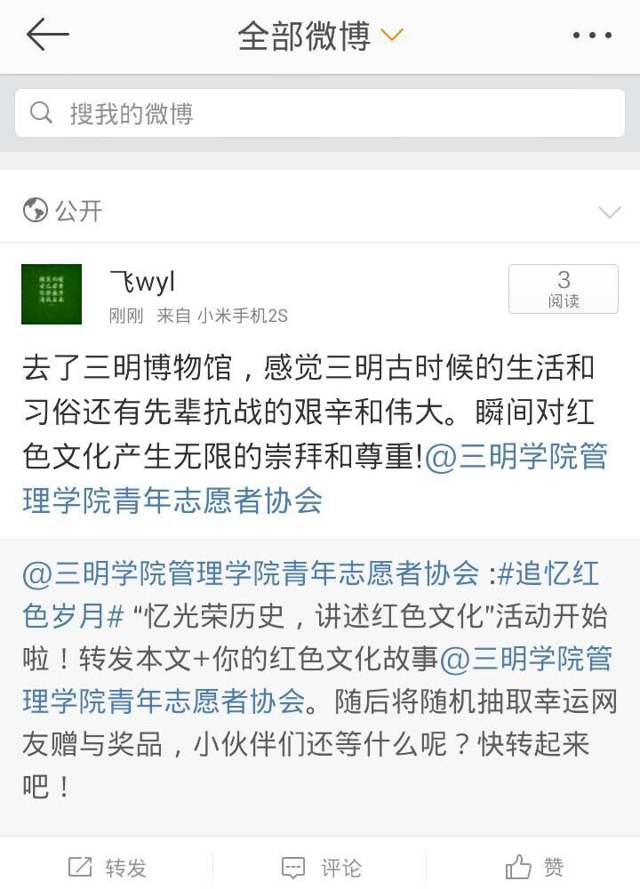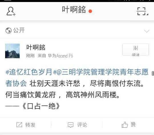 各抒己见话革命,多种形式说历史。同学们参与此次活动的积极性很高,大家都在网络上纷纷发表了自己的独特见解。其中一位志愿者在微博中谈到:“还记得和同学们一起去参加党课、参观博物馆,都是先辈们留下的红色历史。博物馆里红军们勇敢奋斗抗战的身影,让我无法忘记。”2014财务管理1班的同学用豪迈悲壮的诗歌向伟大的革命先烈致敬:“壮别天涯未许愁,尽将离恨付东流。何当痛饮黄龙府,高筑神州风雨楼。”还有2014级的新生在参与活动之后表示,定当倍加珍惜当下的美好生活,努力学习文化知识,提高自身社会实践能力,为建设更强大的祖国奉献力量!