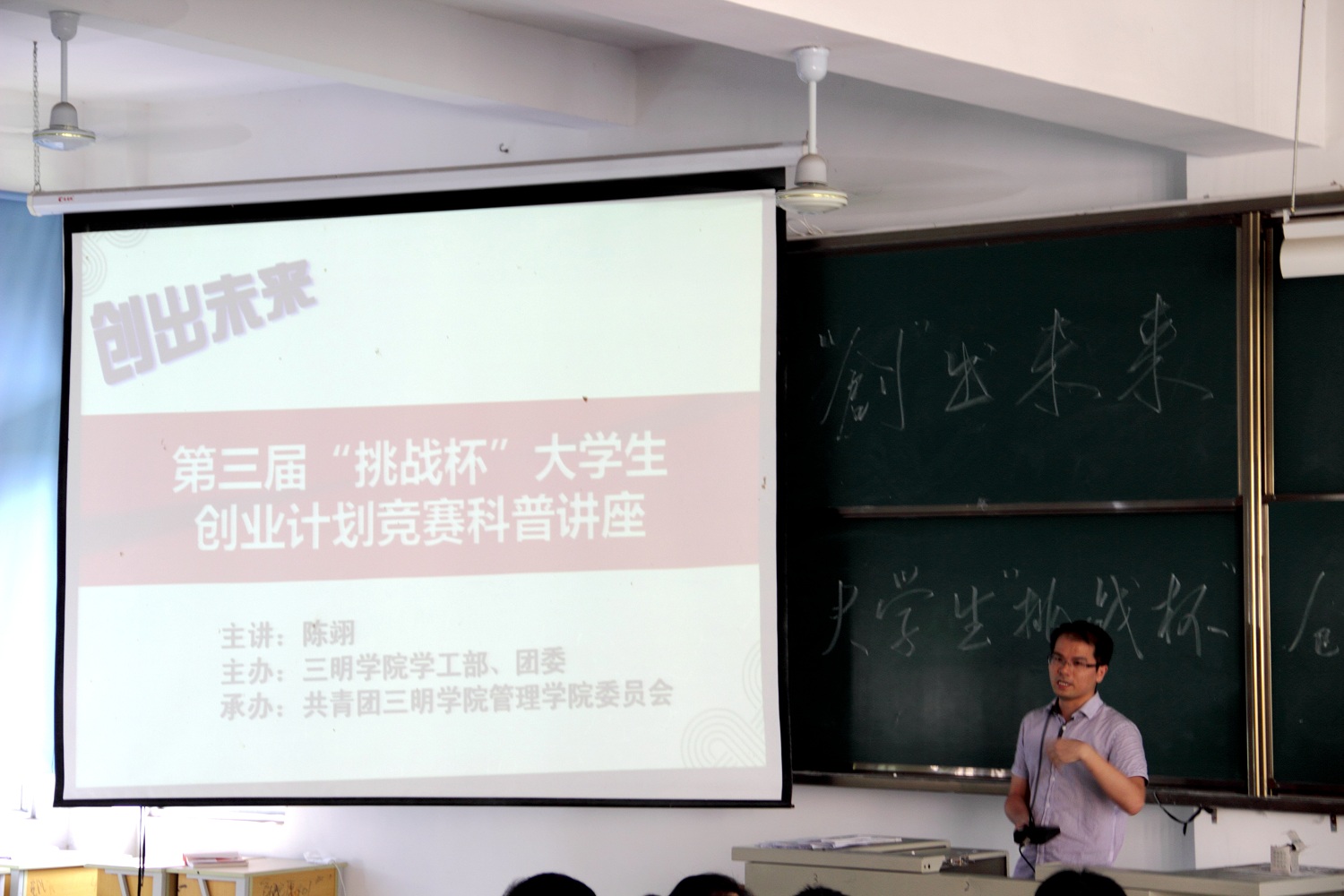 6月24日下午,由三明学院学工部、团委主办,三明学院管理学院承办的“创出未来――第三届挑战杯创业计划竞赛科普讲座”在厚德楼405举行,座邀请到管理学院创业指导陈翊老师为参赛者及同学进行讲解。