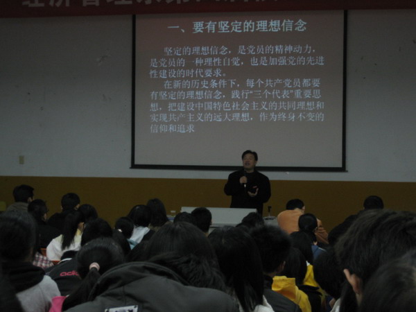 在动员讲话后,江芳俊副院长给全体学员作了题为“以科学发展观指导大学生成长成才”的辅导报告。江芳俊副院长主要从“要有坚定的理想信念、要有崇高的爱国主义精神、要有高尚的思想道德、要有全面发展的目标、要有高尚的责任感和甘于奉献的精神”等五个方面展开阐述。生动而精彩的报告使学员们得到了思想上的升华和洗礼,使同学们更加清醒的认识到成长成才的重要性,坚定了入党的决心。