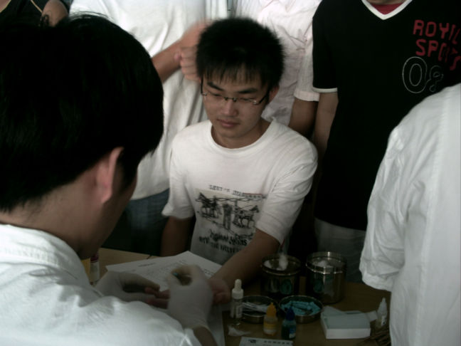 在活动中,救死扶伤的奉献精神得到充分展示,同学们争先恐后地参与到这项感人的公益事业中。献血的同学中有强壮结实的男生,也有纤细瘦弱的女生,献血过程中,同学们毫不犹豫的填下表格,毅然卷起衣袖井然有序的等待着医生的检查。当献血从同学们体内通过输血管道缓缓输入贮血袋是,脸上露出了质朴的微笑。在整个献血过程当中,气氛活跃,场面感人:很多同学都是第一次参加献血,内心激动;有的同学会晕血,但在其他同学的支持鼓励下也勇敢的参加了献血;有的同学在献血过程中有些晕眩,休息之后还坚持要参加献血;有的同学因血站A型血过多暂时没有需要无法献血深表遗憾……。从登记、化验、献血到领取无偿献血证,他们始终从容勇敢。