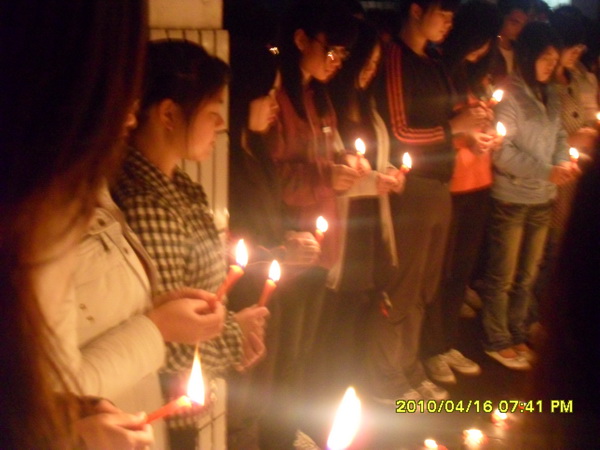 4月16日晚,三明学院经济管理系的同学们在活动广场点亮蜡烛,拼成爱心和“4.14玉树”的字样,为遇难同胞默哀,并为灾区人民祈福。全体学生在烛光中默哀、追思、祝福、祈祷,愿逝者安息,同时倡议大家携起手来,各尽所能,帮助玉树地震灾区人民度过难关!