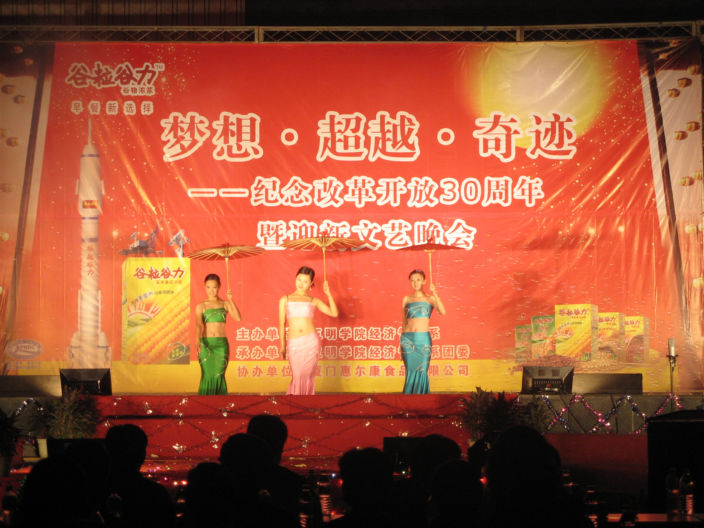 1015日晚七点半,经管系纪念改革开放30周年暨迎新文艺晚会在系篮球场上隆重举行,梁一池副院长、江芳俊副院长、院宣传部杨玉钗部长、艺术系王招凤书记、经管系主任李应春老师、经管系张梅华副书记以及系全体老师莅临现场,观看晚会。全场气氛浓厚,掌声雷动,笑声不断。