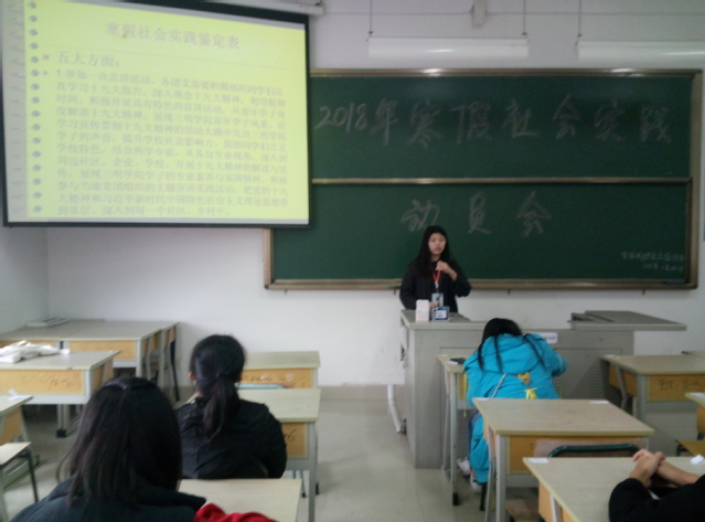 为了进一步学习贯彻党的十九大精神,不忘初心,牢记使命,引领广大青年学生投身社会实践中,为人民服务。1月22日上午,管理学院于厚德楼406教室正式启动以“不忘初心跟党走,青春奋斗中国梦”为主题的2018年寒假社会实践活动,各班团支书及部分学生代表参加了启动仪式。