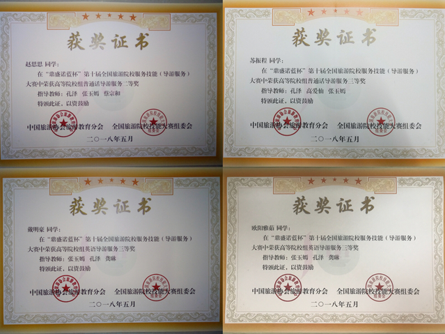 5月10-13日,由中国旅游协会指导,中国旅游协会旅游教育分会和浙江省旅游局联合主办,浙江旅游职业学院承办的“鼎盛诺蓝杯”第十届全国旅游院校服务技能(导游服务)大赛于近期成功落下帷幕,旅游学院16旅教赵思思同学获得普通话讲解二等奖、15旅教苏振程同学获普通话讲解三等奖、15旅教戴明豪同学与16旅教欧阳雅茹同学均获得英文讲解三等奖。