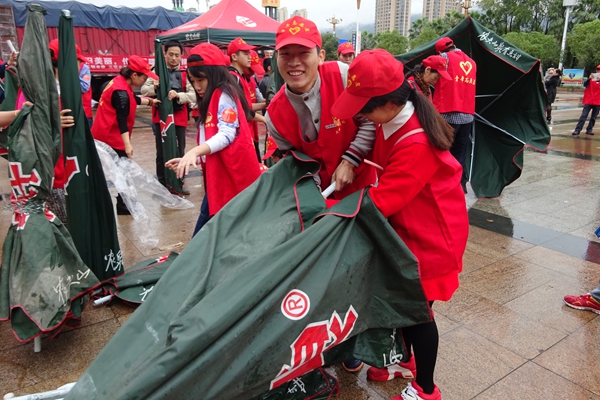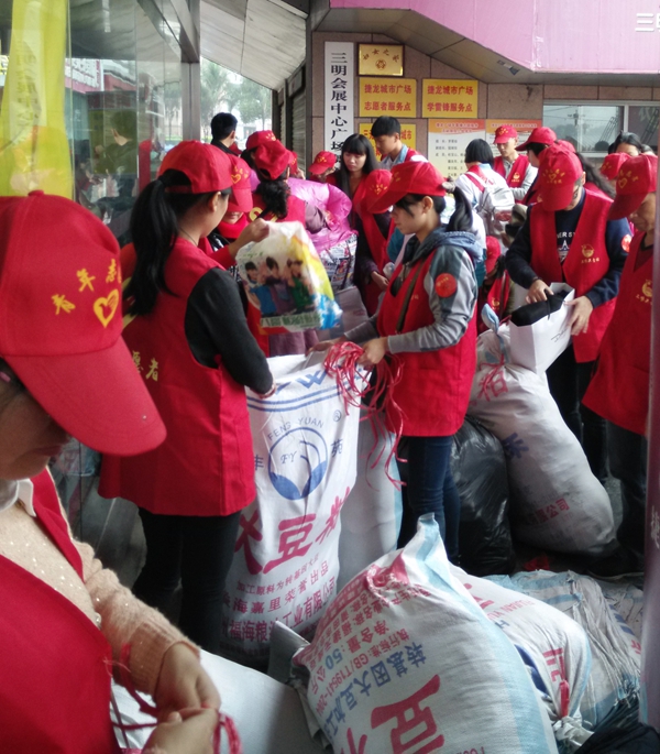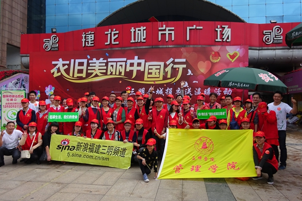 11月14日,微风细雨中,市捷龙广场前聚集了不少市民,大家纷纷送来自家的衣物奉献爱心,参与由我校管理学院青年志愿者协会发起,共青团三明市委、三明市青年志愿者协会、新浪网三明站、福建义工俱乐部、三明学院管理学院团委共同举办的“衣旧美丽中国行”三明全城捐衣送温暖活动。
