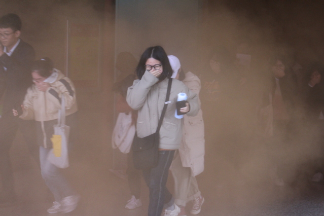 烟雾弹点起,信号员发出火警信号,各教室学生听到哨声后切断教室电源,用湿毛巾捂住口鼻,放低身姿快速向楼梯间移动,有序地撤离至安全地带,并集中列队点名。