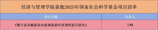 近日,全国哲学社会科学工作办公室正式公布了2025年度国家社会科学基金项目立项名单。经济与管理学院王峥副教授申报的课题《数字技术赋能黄河流域旅游经济韧性提升研究》成功获批国家社科基金西部项目,资助经费20万元,该项目为我校2025年唯一国社科立项项目。