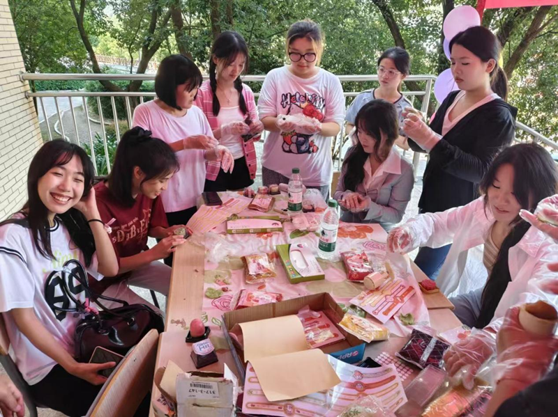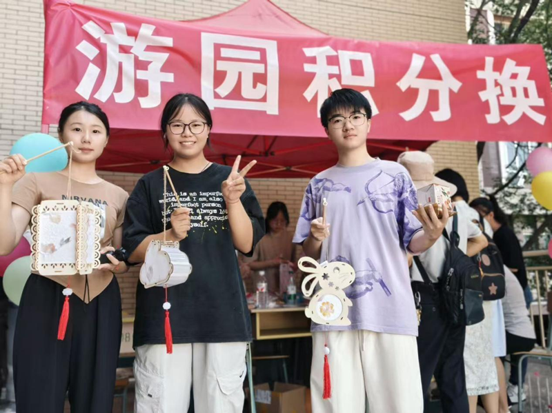 为进一步激发学生参与热情,活动设置了丰富的积分兑换与奖励机制,让文化游园成为实践育人的生动课堂。当参与者积分累计达到76分,即可自主选择“院徽月礼”DIY或“中秋搏饼”两项特色活动。在“院徽月礼”区域,学生们领取面团、馅料等材料,亲手制作印有学院标识的专属月饼,揉面、包馅、压模,每一个步骤都充满乐趣,既体验了传统中秋习俗,又锻炼了动手能力;“中秋搏饼”区域则热闹非凡,骰子碰撞瓷碗的清脆声响不绝于耳,同学们凭积分获得三次摇骰机会,根据点数角逐“状元”“榜眼”“探花”等科举主题奖项,赢取对应月饼奖励,现场笑声与欢呼声此起彼伏。不少学生为赢得心仪奖品,主动尝试所有活动环节,在套圈赢积分的“圈定好运”游戏中锻炼精准度,在书写祝福卡时培养表达能力,在团队协作探讨灯谜时提升沟通技巧,真正实现了在快乐游园中成长,让校园文化在实践互动中焕发新活力。