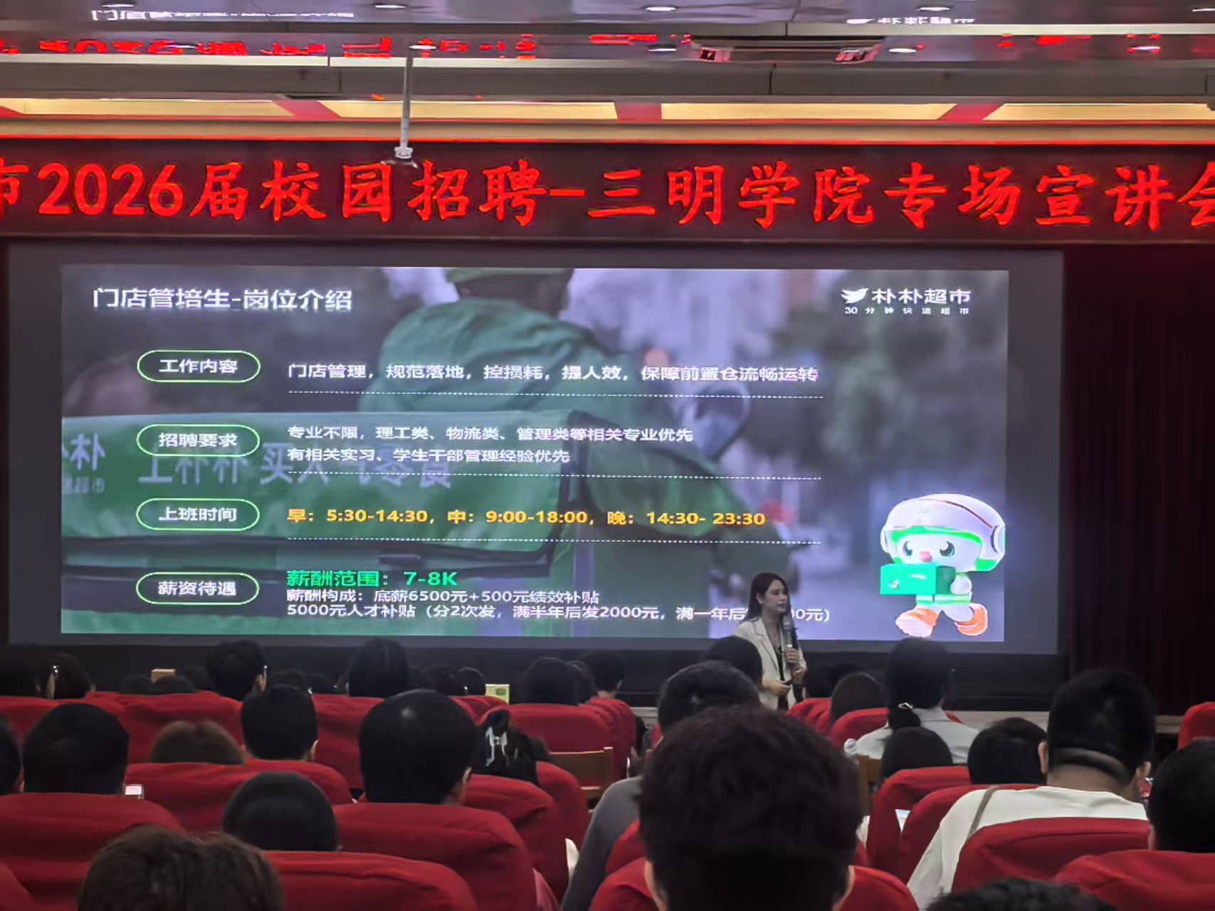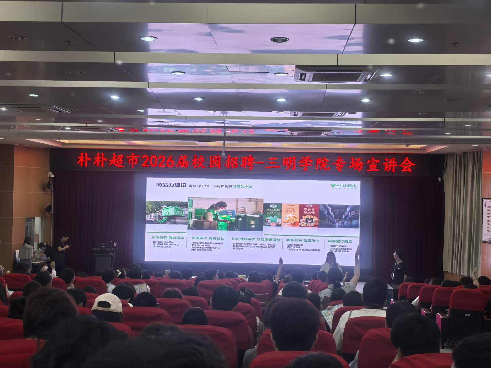 为有效促进毕业生与用人单位精准对接,切实破解高校毕业生就业难题,10月16日,三明学院于逸夫图书馆学术报告厅成功举办朴朴超市2026届校园招聘专场宣讲会。各二级学院学生积极响应、踊跃参与。