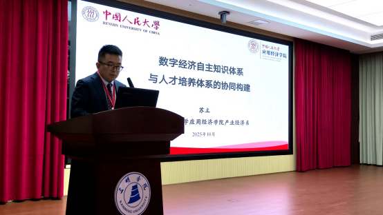 中国人民大学应用经济学院苏立副教授作题为“数字经济人才创新培养与学科建设——中国人民大学的实践与探索”的报告。苏教授从“AI+经济学”交叉创新新路径、全链条人才培养框架建设以及“校企合作+实地调研+产学研基地”立体实践体系构建等多个方面,详细介绍了中国人民大学在数字经济人才培养与学科建设中的探索与经验,使与会者对数字经济人才培养的创新实践有了更加深入的了解。