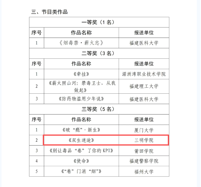 在经管院的积极组织与大力支持下,三明学院经济与管理学院学子参与创作的作品在赛事中表现抢眼。其中,《跨越时空的禁毒使命》系列海报荣获海报类二等奖,《双生迷途》斩获节目类三等奖。这些作品从主题构思到艺术呈现,都凝聚着经管院对禁毒文化宣传教育的重视,以及对学子创新实践能力培养的投入。同时,三明学院凭借在赛事组织与作品创作中的优异表现,荣获优秀组织单位称号。
