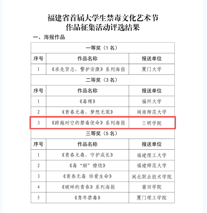 近日,由福建省禁毒委员会办公室、福建省教育厅、共青团福建省委、福建省司法厅戒毒管理局联合主办的福建省首届大学生禁毒文化艺术节作品征集活动评选结果公示,三明学院经济与管理学院全力支持学子参赛。