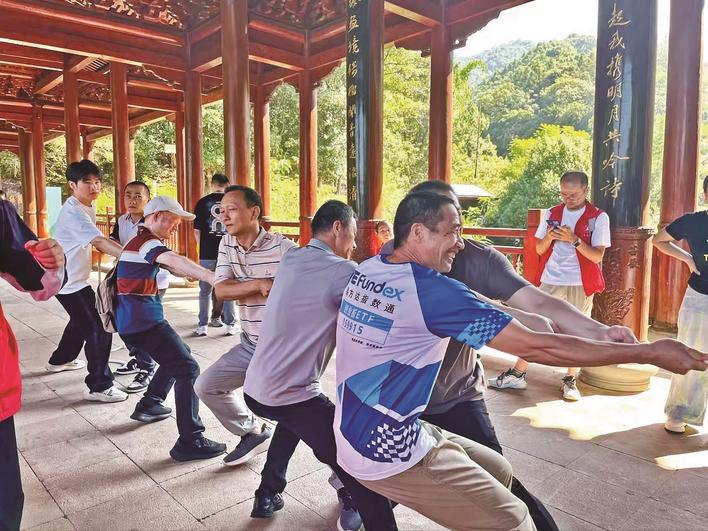 在3.5公里的健步走途中,志愿者化身“专业导盲员”,细致讲解,让视障朋友借助听觉、嗅觉、触觉感受沿途桂花香、芦苇摇与溪水流,沉浸式体验自然之美。途中设置的3个“感官体验点”,是校地双方结合视障群体需求精心设计的环节。抵达廊桥驿站后,大家兴致勃勃地开展“听声辨位抛接球”“双人绑腿折返”等趣味拓展活动,欢声笑语在山谷中回荡。