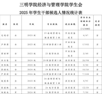 经过三明学院经济与管理学院第六届学生代表大会,现将院级组织工作机构组织和院级学生会组织工作人员名单公示如下: