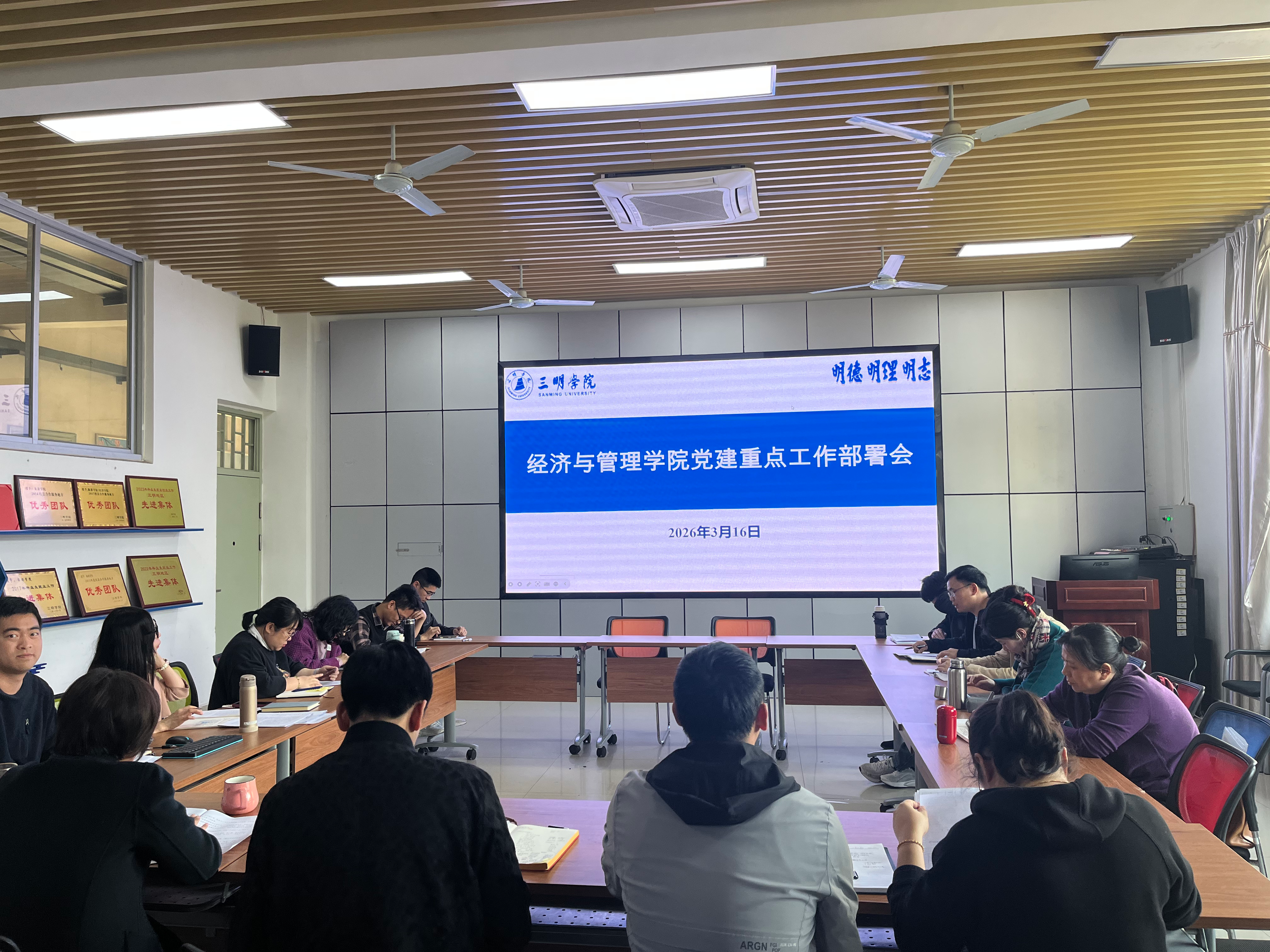 3月16日下午,经济与管理学院在厚德楼312会议室召开2026年党建重点工作部署会暨党支部书记工作例会。学院领导班子成员、各党支部书记、各科(系)室负责人参加会议。