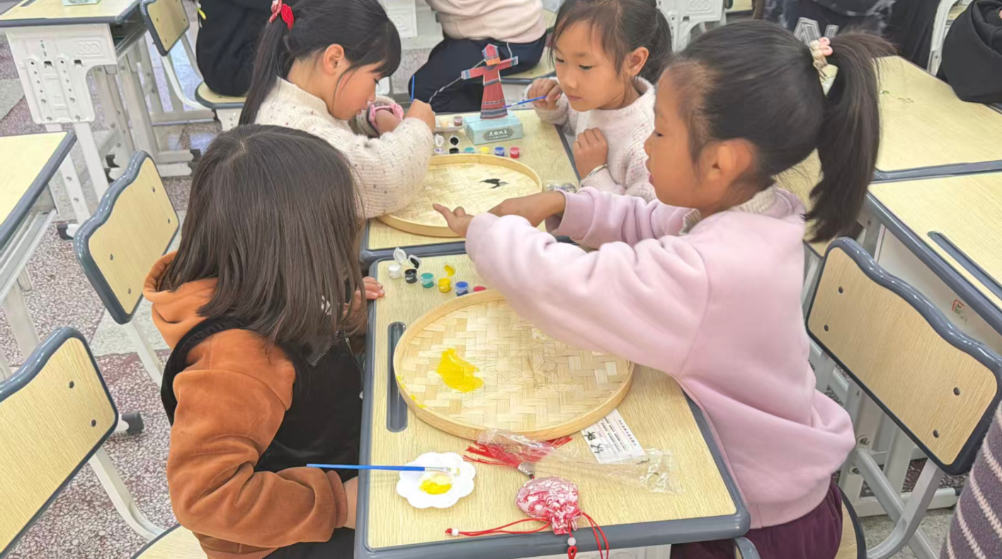 在民族彩编课堂上,志愿者带着畲族、苗族传统纹样的美好寓意,与孩子们一同穿线编织、涂色创作。指尖缠绕的是民族风情,画笔勾勒的是文化新芽,童真与非遗温柔相拥,绘就各民族文化美美与共的动人画面。