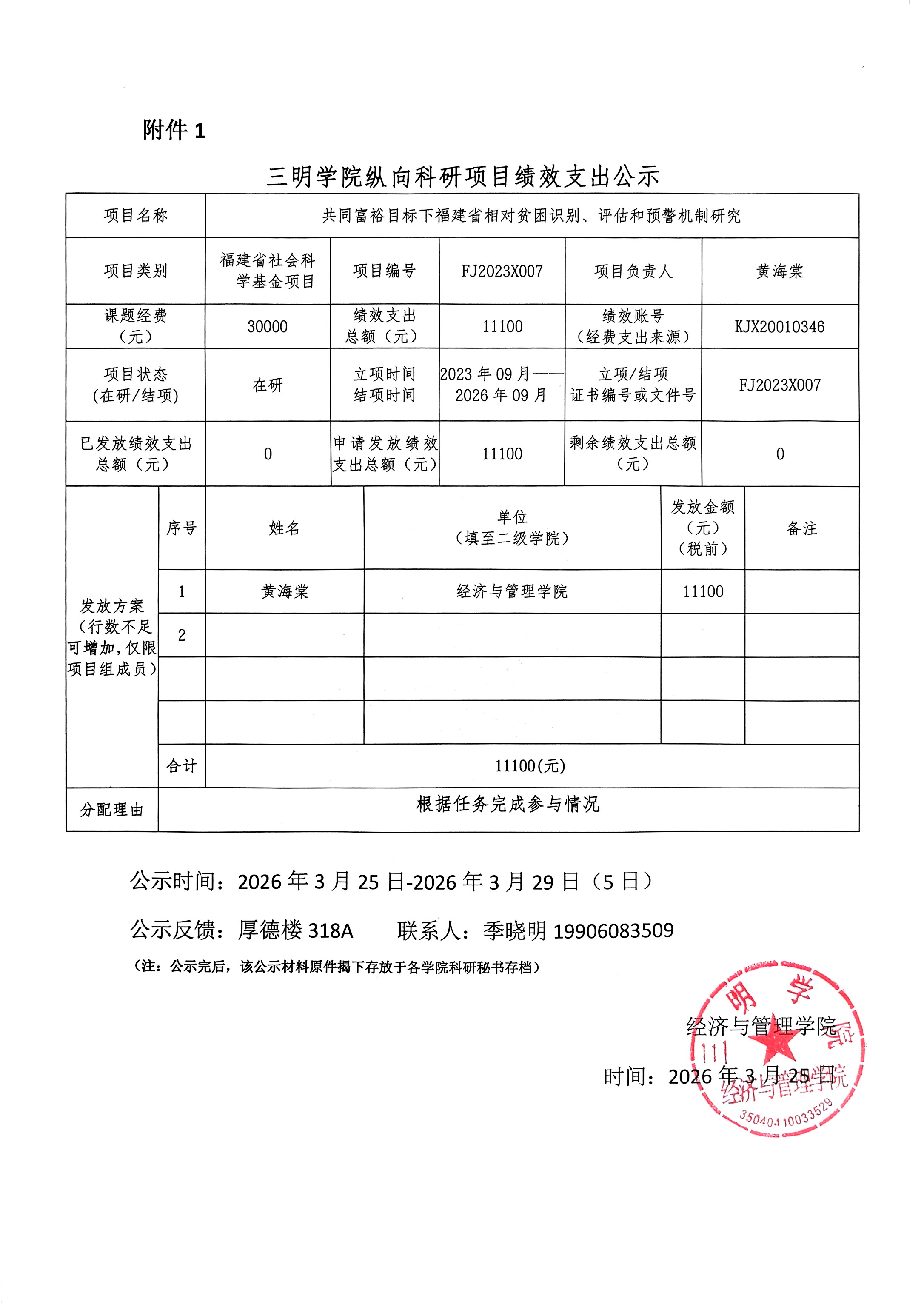 根据《三明学院纵向科研项目经费管理办法(修订)》文件要求,现将黄海棠老师“共同富裕目标下福建省相对贫困识别、评估和预警机制研究(FJ2023X007)”项目纵向科研项目绩效支出予以公示。具体内容如下: