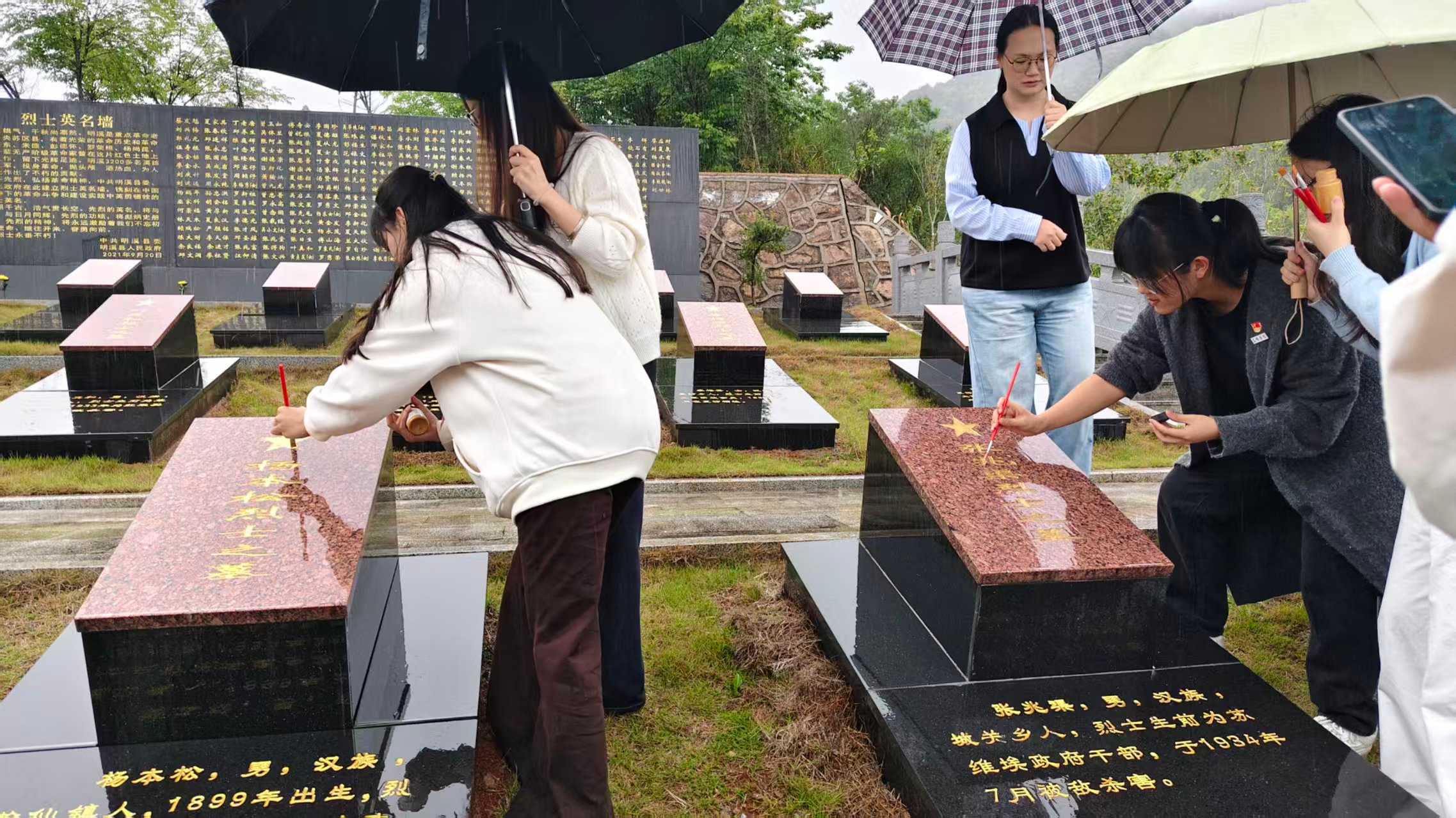 活动过程中,突降大雨,但全体师生党员不畏风雨,手持雨伞,井然有序地推进各项工作。烈士墓碑作为革命历史的重要见证,因长期受自然环境影响,部分碑文和标识出现褪色、模糊现象。活动中,党员们分组协作,首先用清洁工具仔细清理墓碑表面的灰尘与污渍,确保碑文清晰可辨。随后,大家一手撑伞,一手执笔,蘸取金色油漆,认真细致地为褪色的碑文、五角星及标识描金,力求每一笔精准无误,避免油漆渗漏污染。描金工作完成后,党员们又主动清理现场,保持陵园环境整洁。